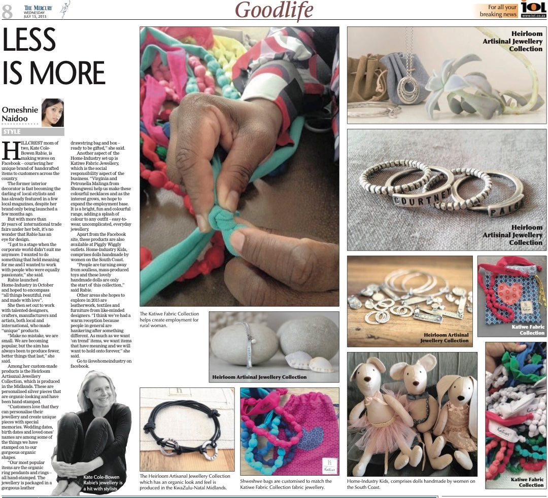 Back in 2015, The Mercury profiled Home-Industry founder Kate Cole-Bowen, highlighting the brand’s early days and unique vision. The article showcased Kate’s passion for creating handcrafted, meaningful pieces — from personalised artisanal jewellery to colourful fabric necklaces made in collaboration with local women. Even then, Home-Industry was recognised for its focus on fewer, better things made with love, and its mission to support community makers while bringing beauty and purpose to everyday gifting.